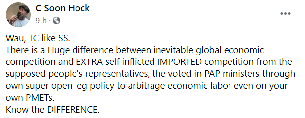 Current situation is totally different, as there is uncontrolled influx for foreigners in the sectors that most Singaporean can do . It cannot be for a Singaporean to have all the National Service/Reservist obligations and yet to compete with a foreigner with neither and also the cost of owning homes.