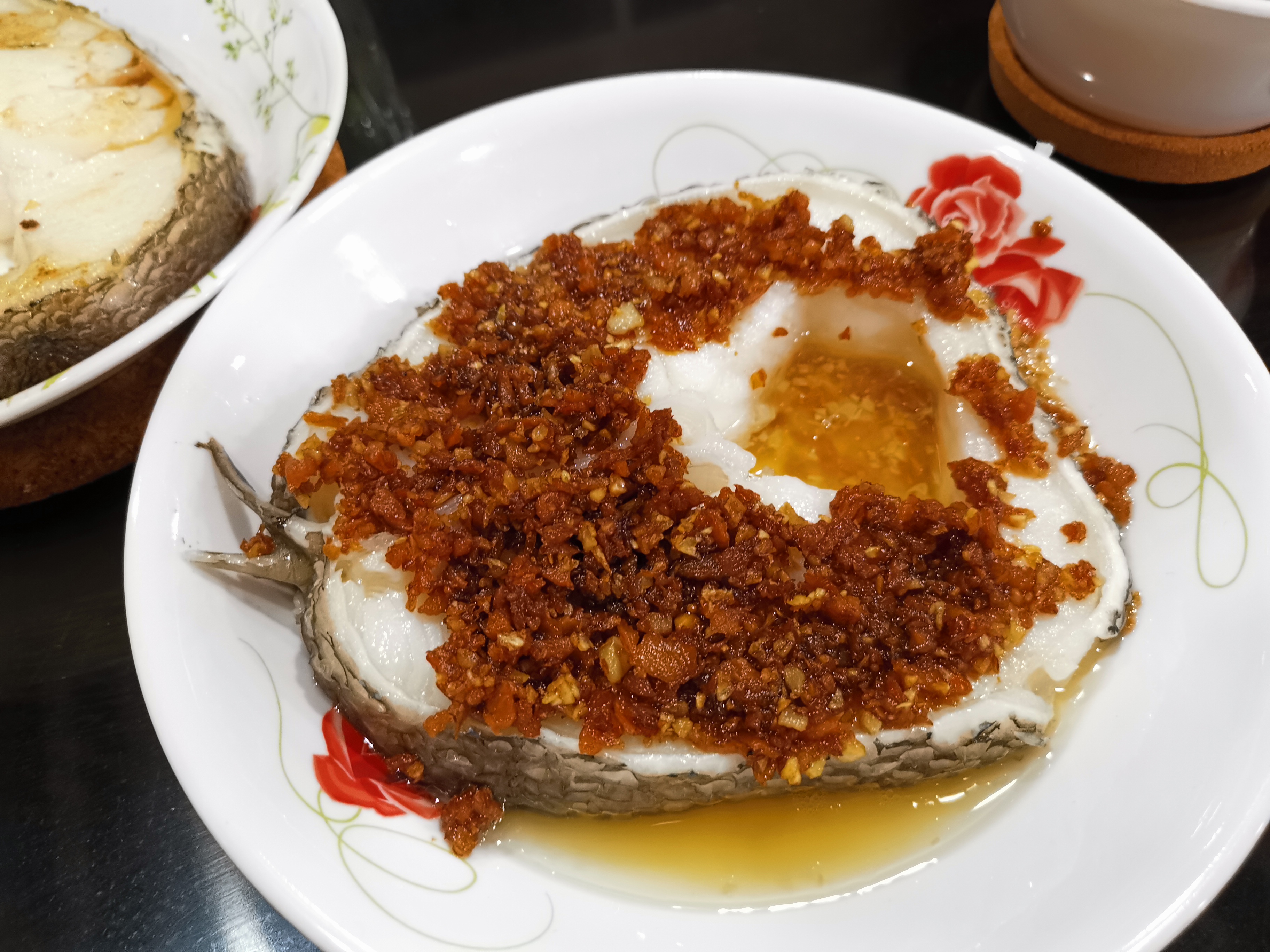 Steamed snow fish with chai-por and garlic on top