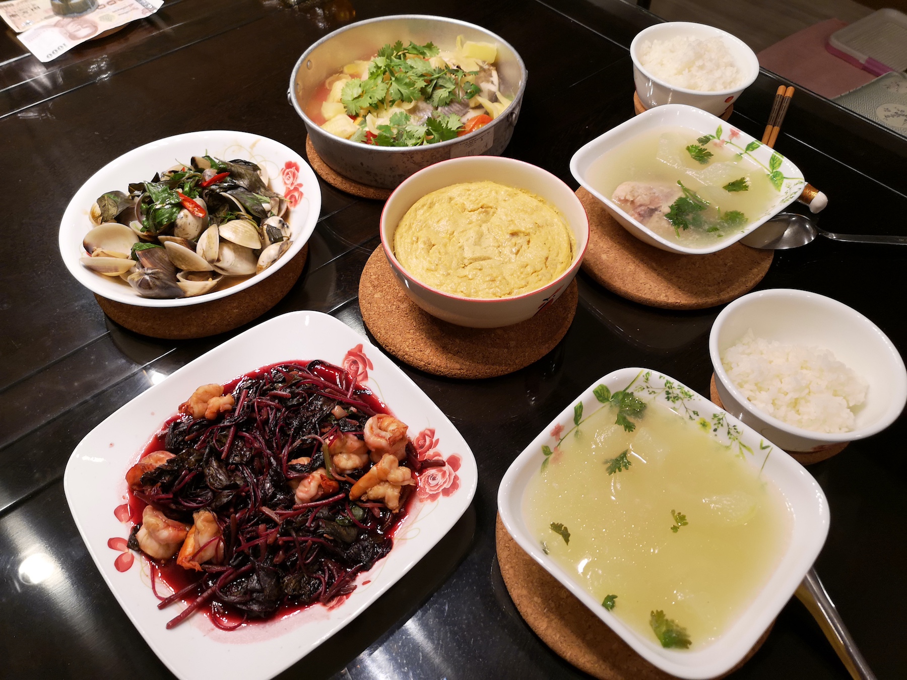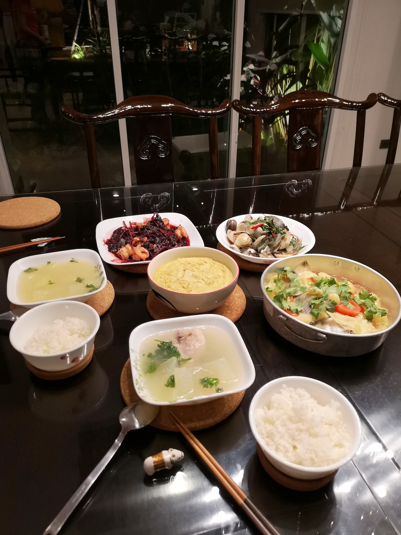 So from the marketing this is the result when I am free - steamed pomfret, melon soup, steamed egg with minced pork, clams, red spinach with prawns