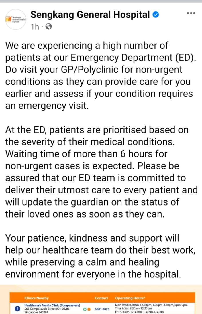 Similarly, SGH put up a Facebook post on Friday morning saying that it is seeing “a high number of patients” at its A&E department.
