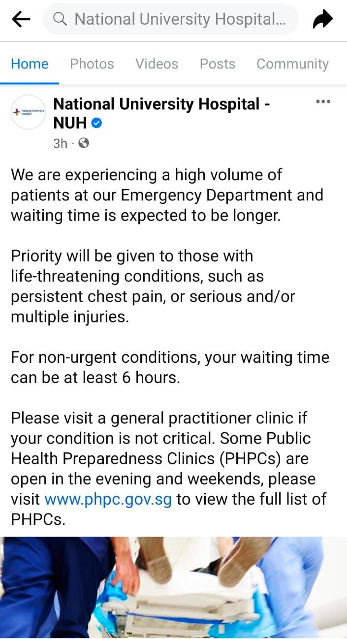 “We seek the public’s understanding that longer waiting time is expected at our emergency departments and priority will be given to patients with more serious conditions and who require admission,” said an NUHS spokesman.