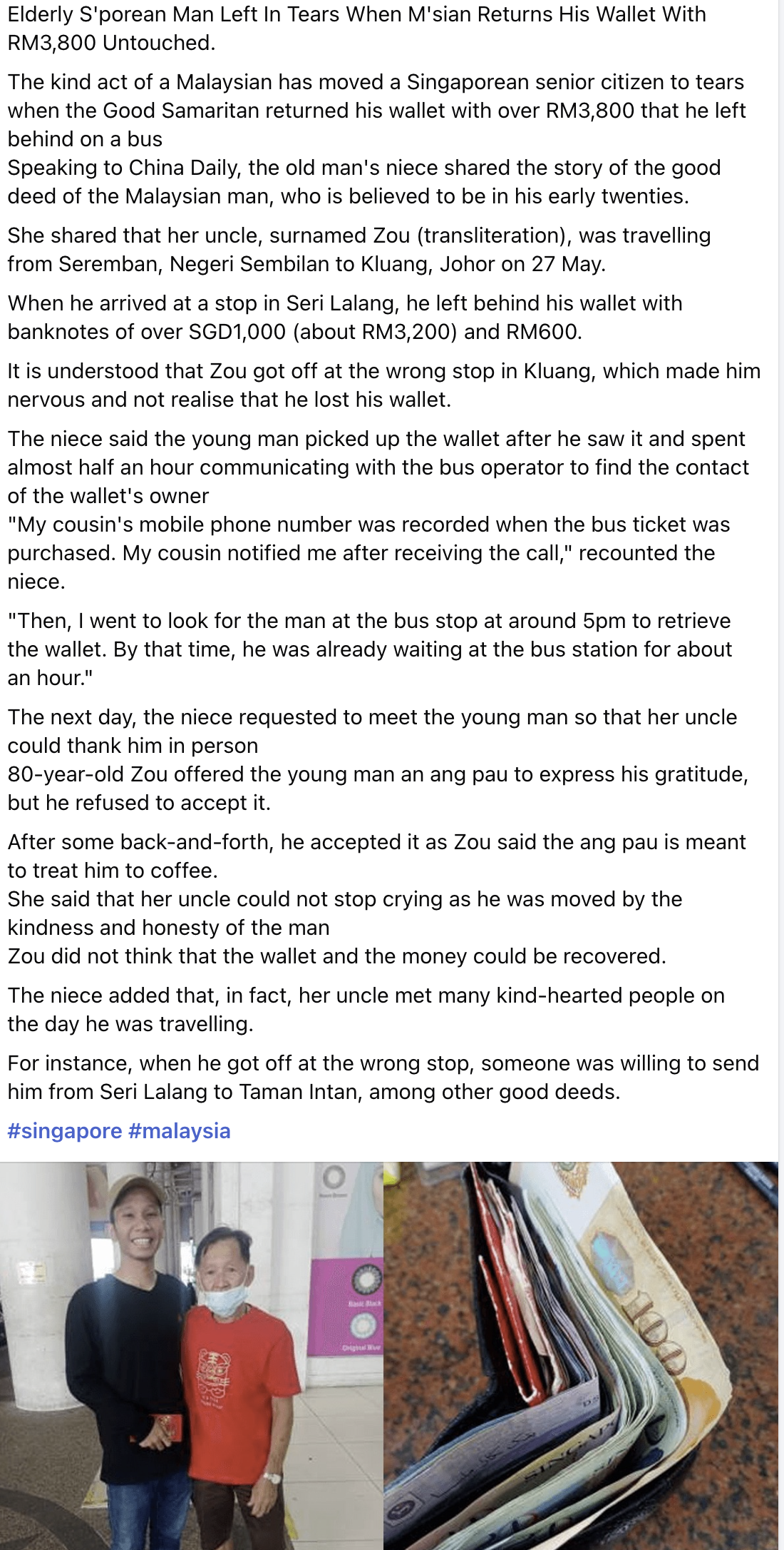 A honest Malay man and a grateful Singaporean Chinese who has learnt a lesson that not all are like the greedy Singagoreans.