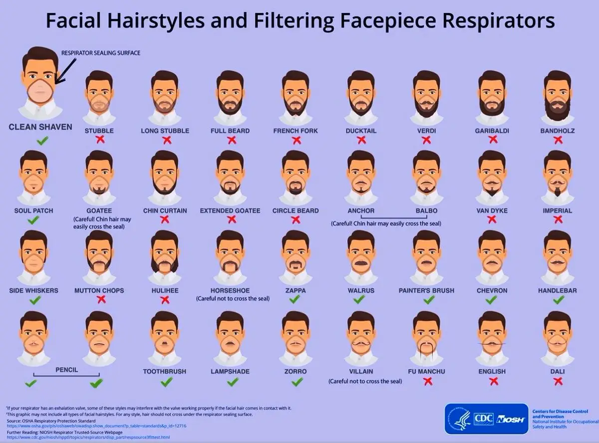 There is a disclaimer on the bottom of the explainer: “This graphic may not include all types of facial hairstyles. For any style, hair should not cross under the respirator sealing surface.”