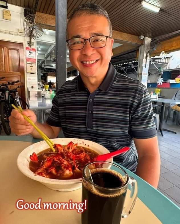 That bowl of thick soup, high sodium, high cholesterol prawn noodles with high sugar thick black coffee is a complete unhealthy combination everyone should avoid. He is encouging everyone to eat such breakfast?