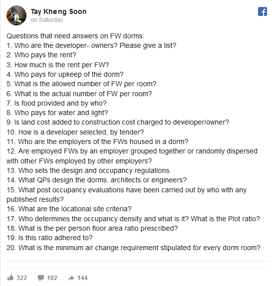 There are people who KPKB and then THERE ARE PEOPLE WHO KPKB. Peasants KPKB do have affect as you can see from above, but when a big name KPKB, you better believe the Pigs Are Pigs will sit up and notice. And the reason they do this is because Big Names are POFMA and LAwsuit free because they are current or recent members of the Establishment. Take Tay Kheng Soon for example. When social activists, Tommy Koh, and other peasants complain about how poor the FW accommodations are and how Pigs Are Pigs Crassloot Leeders are making so much money from their dorms, even TKS also not happy because he was not cut in on the deals. SO, what does he do? He KPKB. And when he KPKB, not only Pigs Are Pigs listen, but even peasants take notice. Look for impending changes to come down the pipe. Don't be surprised if one or 2 rich Crasslooters get their dorms shut down as an aftermath.