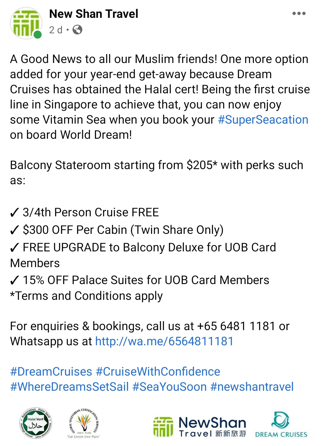 Technically, if halal certified then the whole cruise must also be completely halal and all alcohol, pork, casino and cabaret shows must be banned on board.