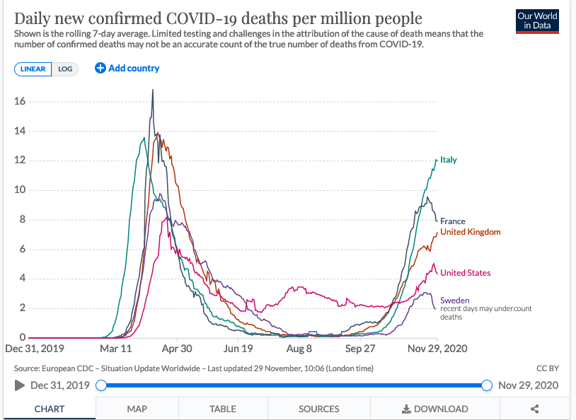 September 2020 was the least deadly month in Swedish history, in terms of number of deaths per 100,000 population. Ever. And I don’t mean the least deadly September, I mean the least deadly month. Ever. To me, this is pretty clear evidence of two things. First, that covid is not a very deadly disease. And second, that Sweden has herd immunity.