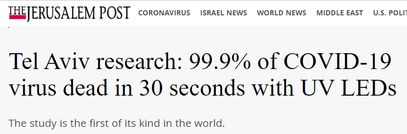 Tel Aviv research: 99.9% of COVID-19 virus dead in 30 seconds with UV LEDs