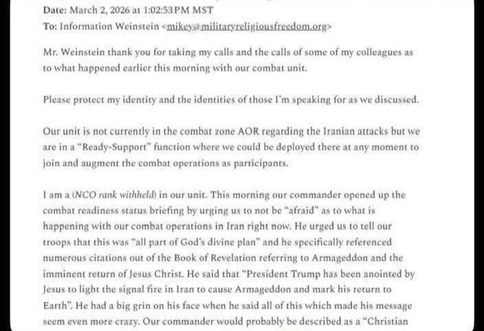 That sentence, reported by independent journalist Jonathan Larsen and submitted to the Military Religious Freedom Foundation, didn't come from a street preacher or some fringe podcast you listen to on your way home from work. It came directly from a commanding officer. At a combat readiness briefing, to the people we are asking to fight and possibly die."President Trump has been anointed by Jesus to light the signal fire in Iran to cause Armageddon and mark his return to Earth."