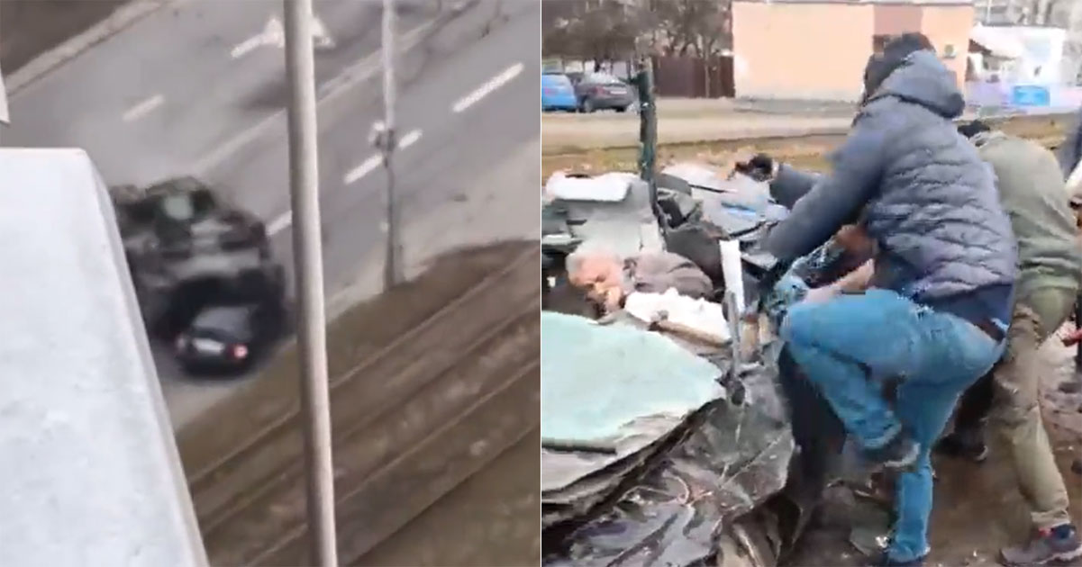 A Russian tank crushed a moving car with a civilian inside on the streets of Ukrainian capital Kyiv in the Obolon district on Feb. 25, a day after the country was invaded.