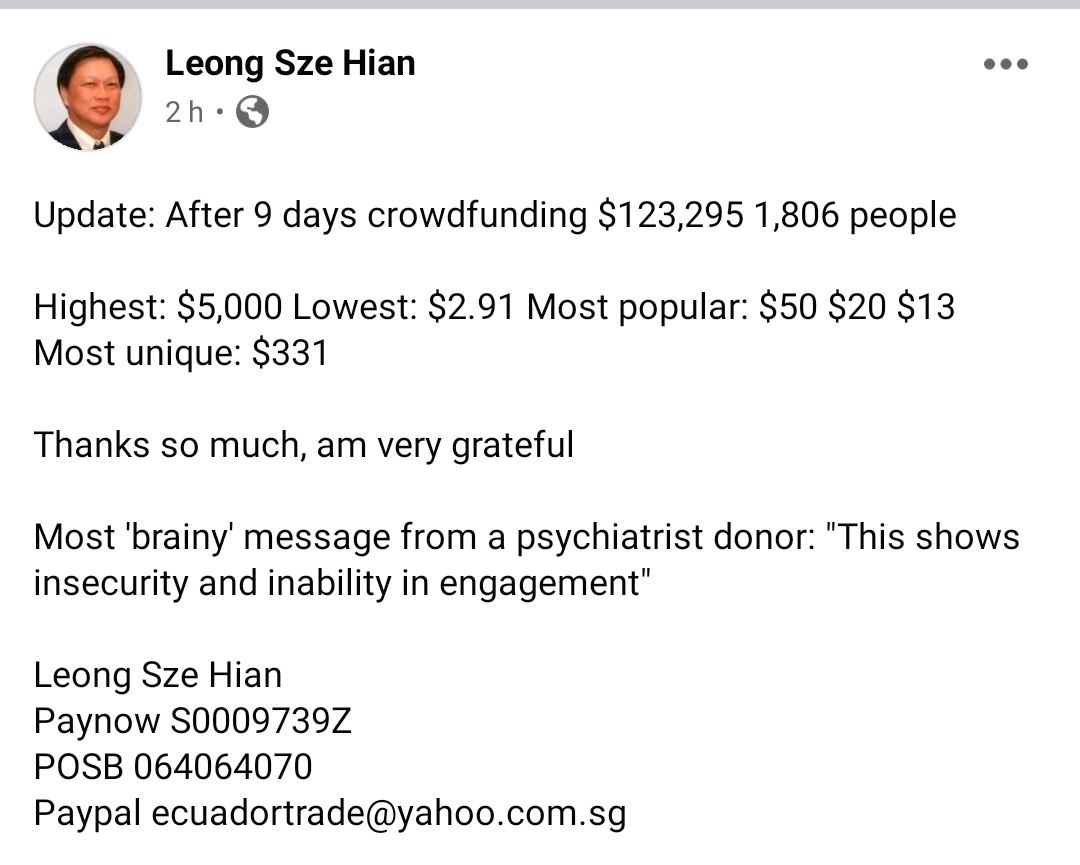 Mr Leong, a financial advisor and blogger, initiated his crowdfunding effort on 25 March after the High Court ordered a sum of $133,000 to be pay to PM Lee for the defamation suit brought against Mr Leong by PM Lee.