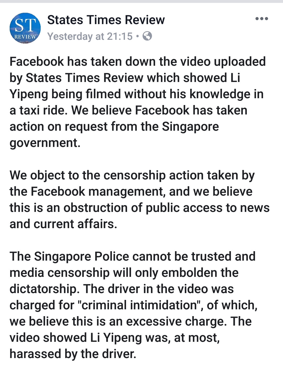 Facebook has taken down the video uploaded by States Times Review which showed Li Yipeng being filmed without his knowledge in a taxi ride. We believe Facebook has taken action on request from the Singapore government. We object to the censorship action taken by the Facebook management, and we believe this is an obstruction of public access to news and current affairs. The Singapore Police cannot be trusted and media censorship will only embolden the dictatorship. The driver in the video was charged for "criminal intimidation", of which, we believe this is an excessive charge. The video showed Li Yipeng was, at most, harassed by the driver.