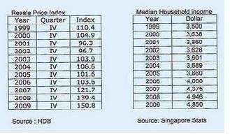 1. From 1990 to 2009, RPI rose to 442 (442% of the base year) but household income rose only to 211 (211% of the base year) i.e. income rose at roughly half the rate property rose over a 20 year period. The RPI was only 34.1 in 1990, today it is 154 i.e. a HDB flat today is 4.5 times the price 20 years ago but household income is only 2.1 times.