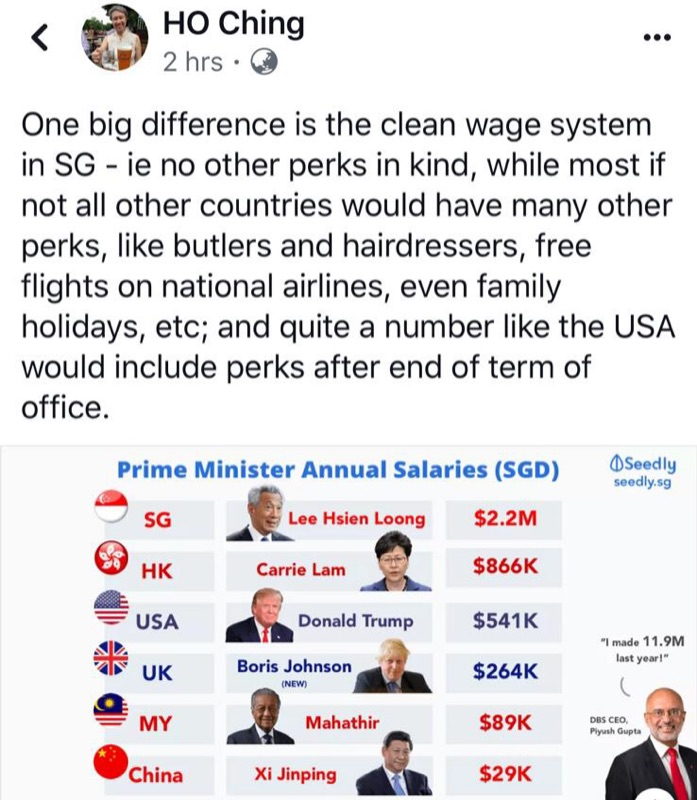 said in a post published Wednesday. She was responding to an article by local blog site Seedly that compared Lee’s pay to that of U.S. President Donald Trump, Hong Kong Chief Executive Carrie Lam and others.