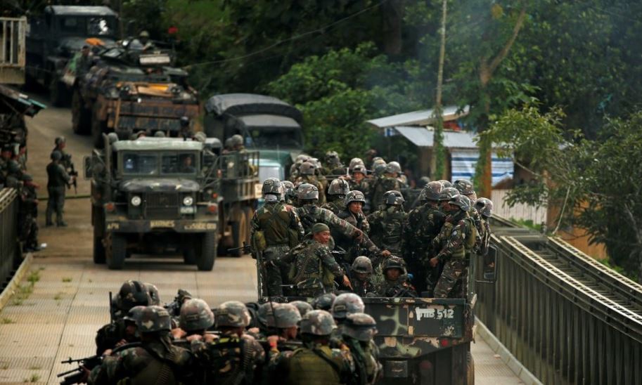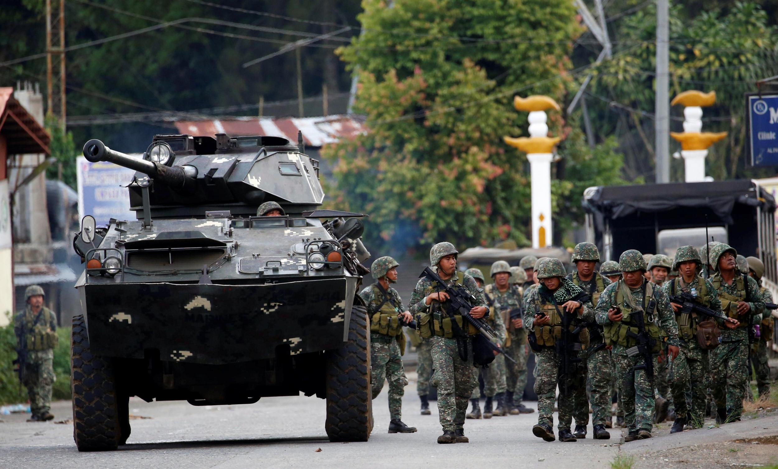 at least a brigade of well equipped troops with armor support are poured in. the ammo webbing on the pinoy troops plus their weapons will tell you these are no boy scouts. they are some of the elite troops of failurepines. commanders checking smartphones somemore. must be vulgar text from duterte. but truly, they are running google map and google earth to find their way around. htc phones. this is a marine unit.