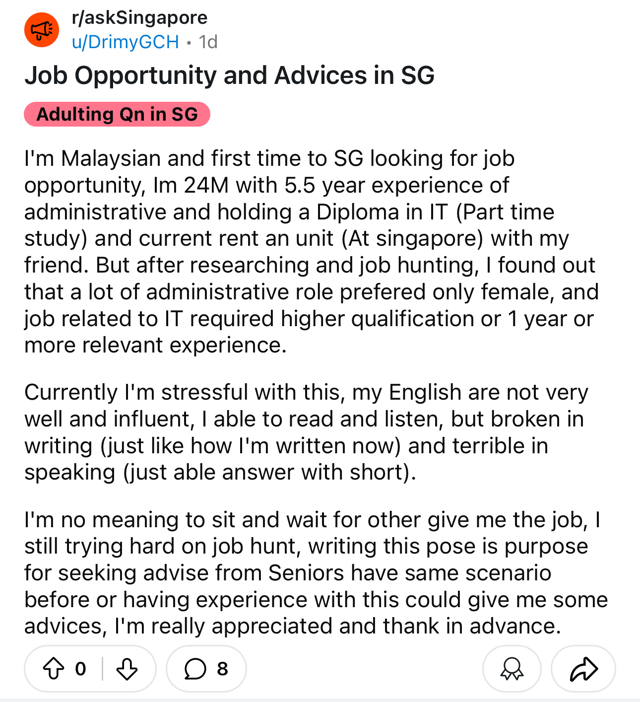 Chitchat Mudlaysian guy wants advice to steal job in Singapore