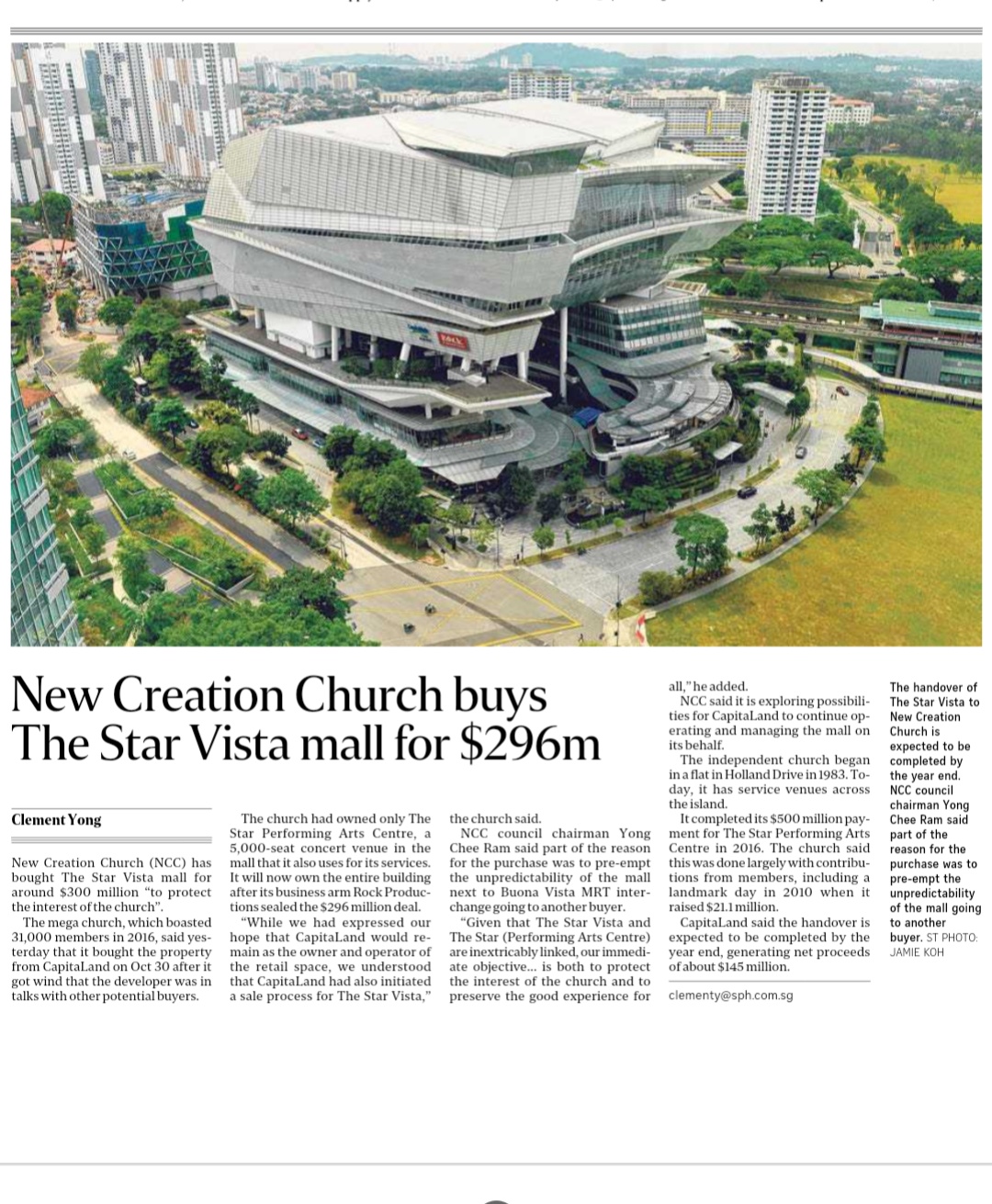 Serious New Creation Church Buys Star Vista Mall For $300M To Protect The Interest Of Their Church! No Porn, No Massage Shops Allowed!