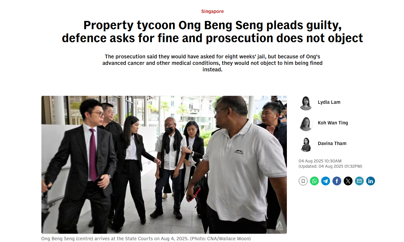 SINGAPORE: Property tycoon Ong Beng Seng pleaded guilty on Monday (Aug 4), in a case linked to former transport minister S Iswaran. Ong, 79, admitted to one charge of abetting Iswaran in obstructing the course of justice by helping the latter pay S$5,700 (US$4,480) to Singapore GP for a business class flig