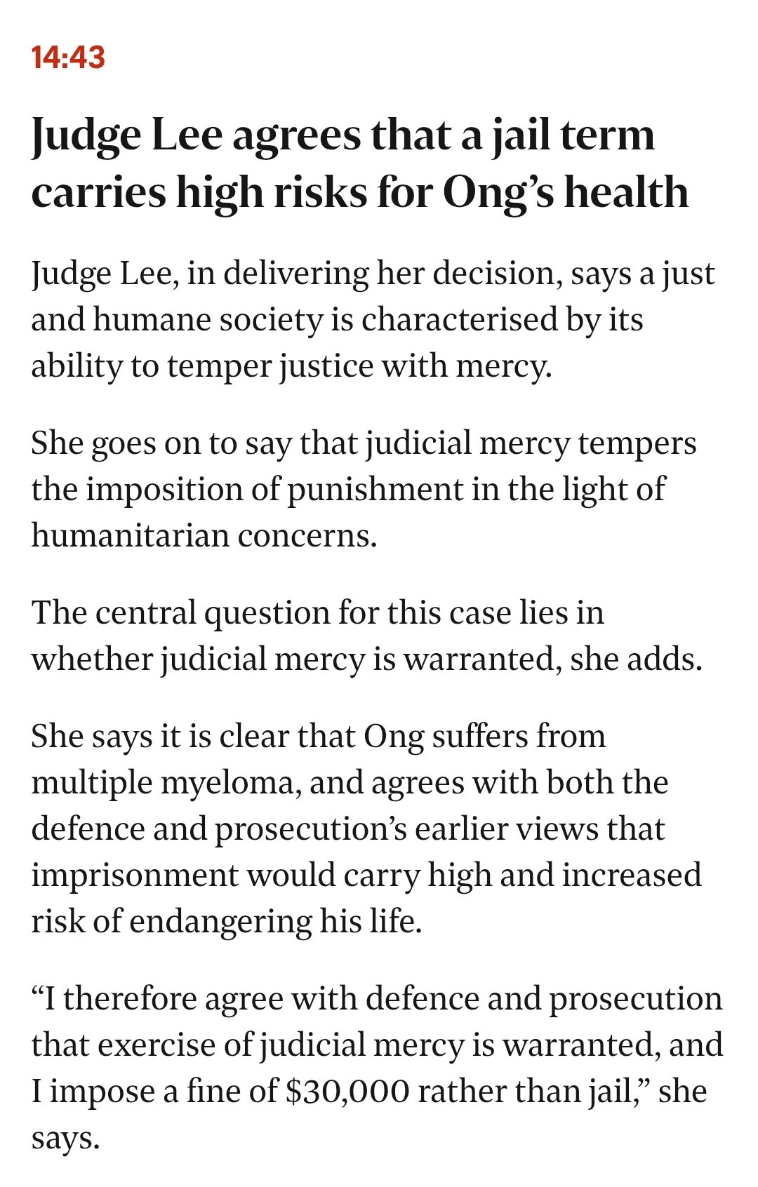 Ong’s lawyer, Senior Counsel Cavinder Bull, told the court on Aug 4 that Ong suffers from a “devastating cocktail of medical problems”, noting that a fall could lead to his death.