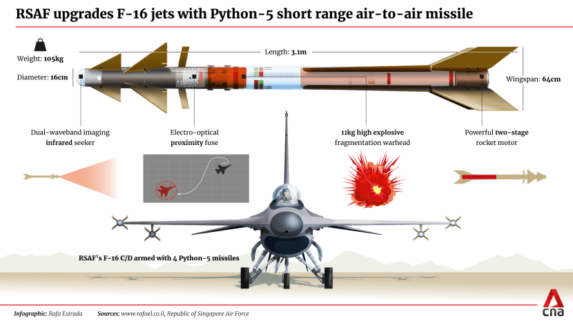 An information board at the Paya Lebar Air Base – where the RSAF’s 55th-anniversary open house will be held on Saturday (Sep 9) and Sunday – shows that its Lockheed Martin F-16 C/D/D+ fighter aircraft now carry the Python-5 missiles, according to a report by security intelligence firm Janes.