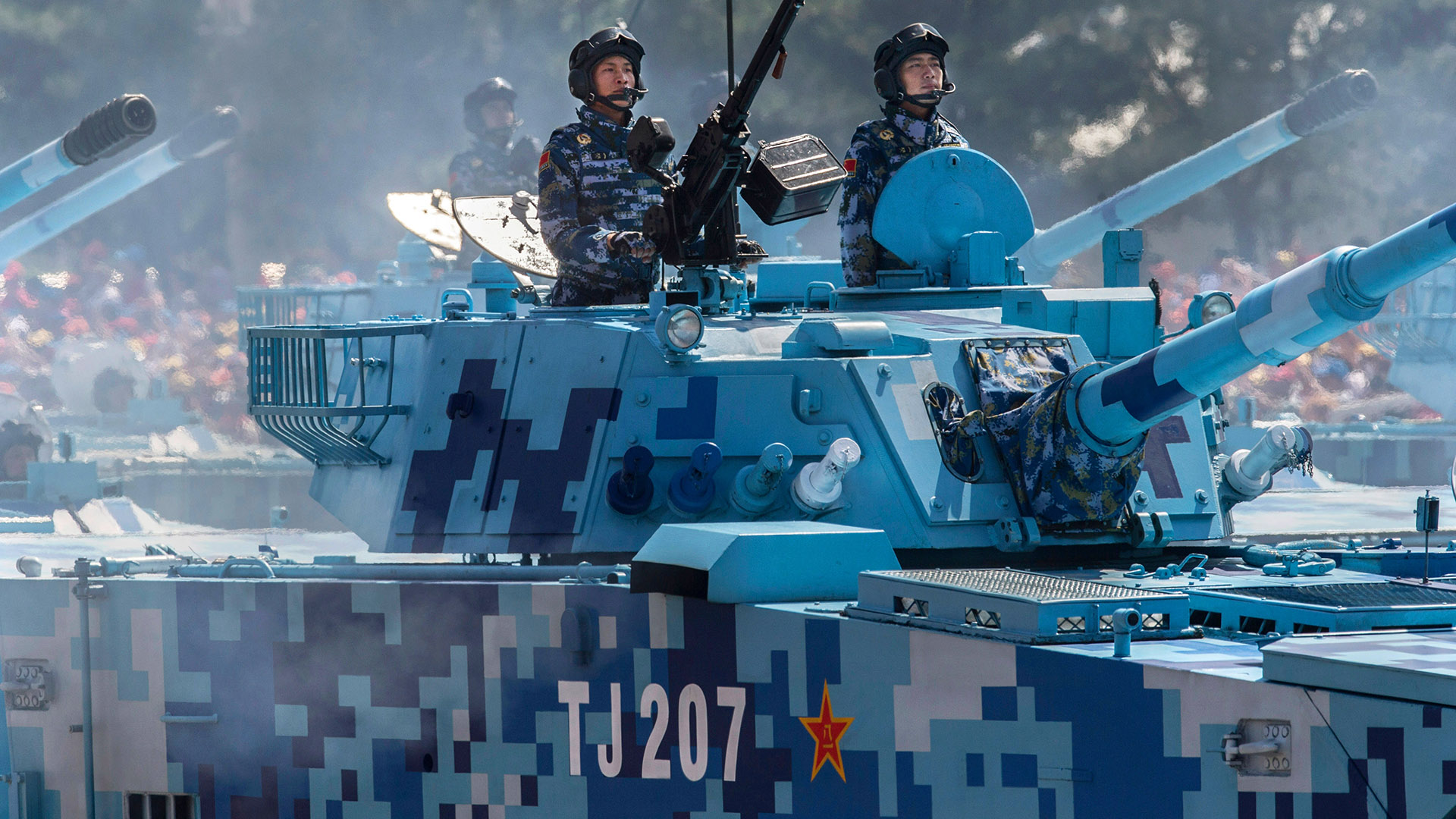 Another conundrum with the modern camouflage design seen during China's Victory Day parade is that the vehicles feature bright blue painted blocks. Why? Some experiments have been done with bluish tones to break up the shape of vehicles against the sky on flat terrain, or for use in icy or snowy areas. “If the vehicles are amphibious then they might have some concealment during their water-based maneuvers, but the trade off for being highly conspicuous on land is not worth having it permanently,” believes Guy Cramer of Hyperstealth Biotechnology. In this case, the blue scheme is likely there for decoration. It certainly made the parade a spectacle, but further muddies the murky world of military camo. —JS