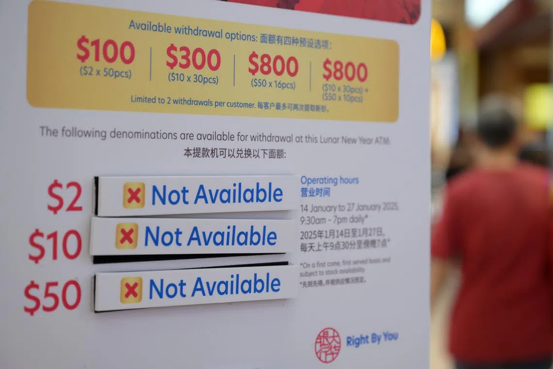 A signboard put up for the unavailability of new notes at UOB branch in Bukit Panjang Plaza on Jan 14, 2025. The ATM at the branch issuing new notes has been undergoing servicing since 10 plus in the morning. Customers who registered online had no problems picking notes reserved for them. Those who do not mind ?fit-for-gifting? notes did not face problems too.