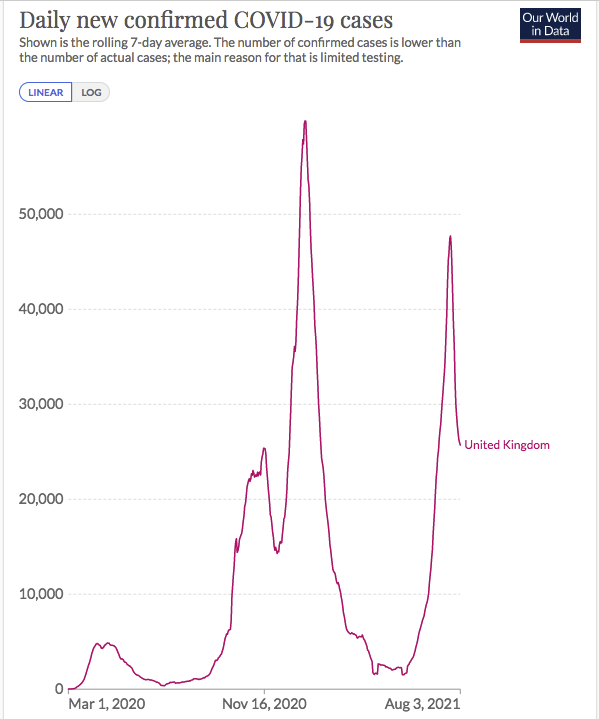 The UK graph shows the success of vaccinations. IN spite of opening up, the infectivity of the disease is lesser.