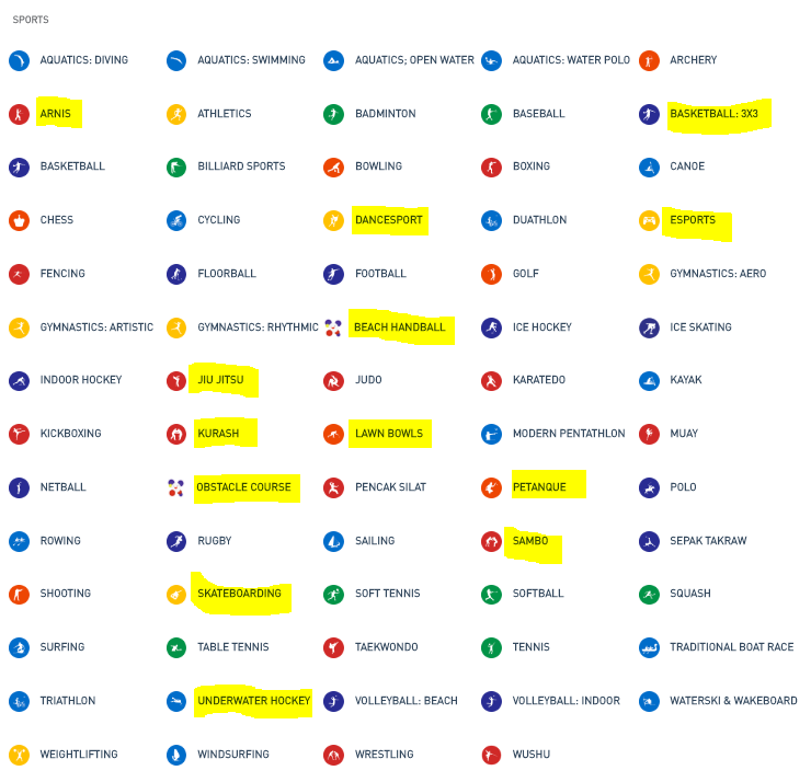 To be honest, the host country would include sports that give them a medal count advantage ,, I don't even know what some of the highlighted sports are ... or whether sinkies play them competitively at all: