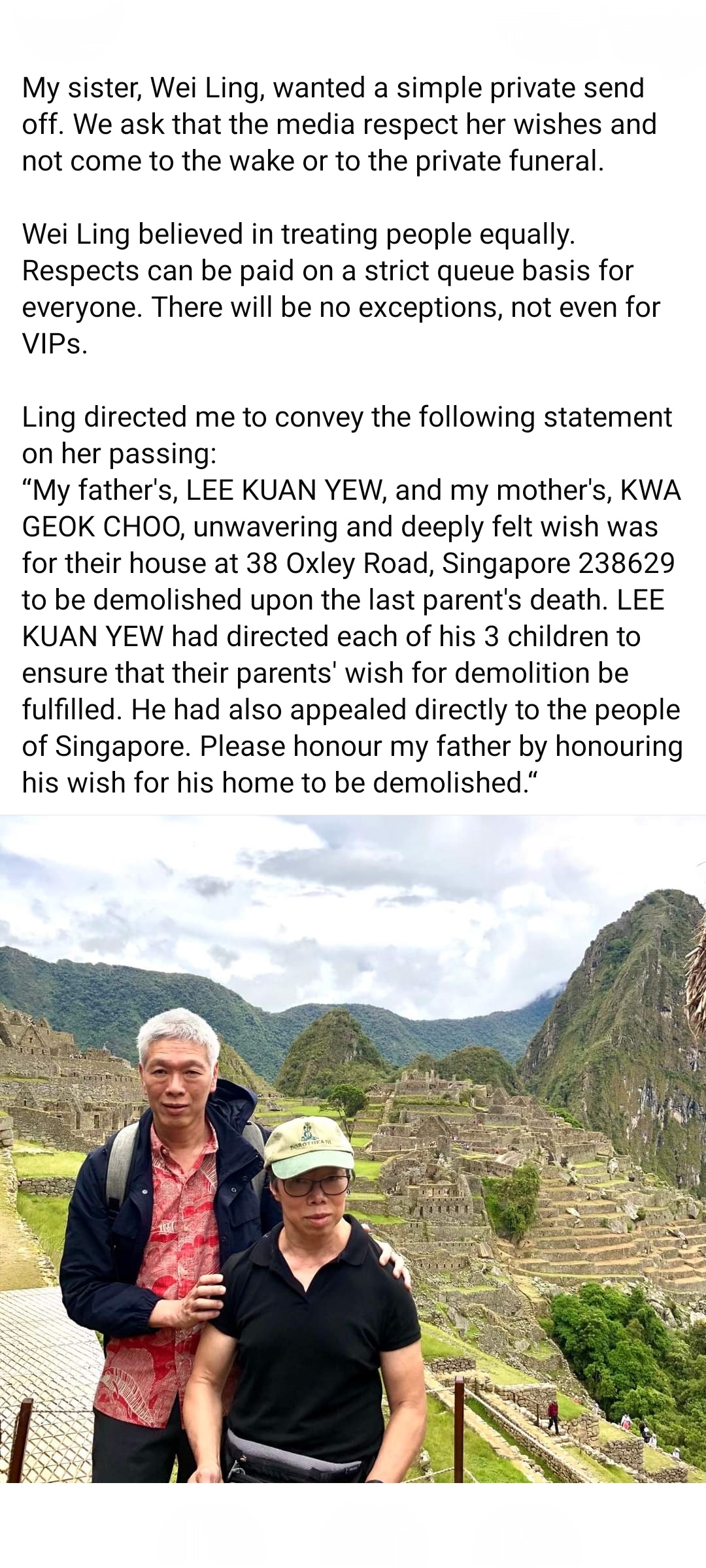 "My father's, LEE KUAN YEW, and my mother's, KWA GEOK CHOO, unwavering and deeply felt wish was for their house at 38 Oxley Road, Singapore 238629, to be demolished upon the last parent's death. LEE KUAN YEW had directed each of his three children to ensure that their parents' wish for demolition be fulfilled. He had also appealed directly to the people of Singapore. Please honour my father by honouring his wish for his home to be demolished.”