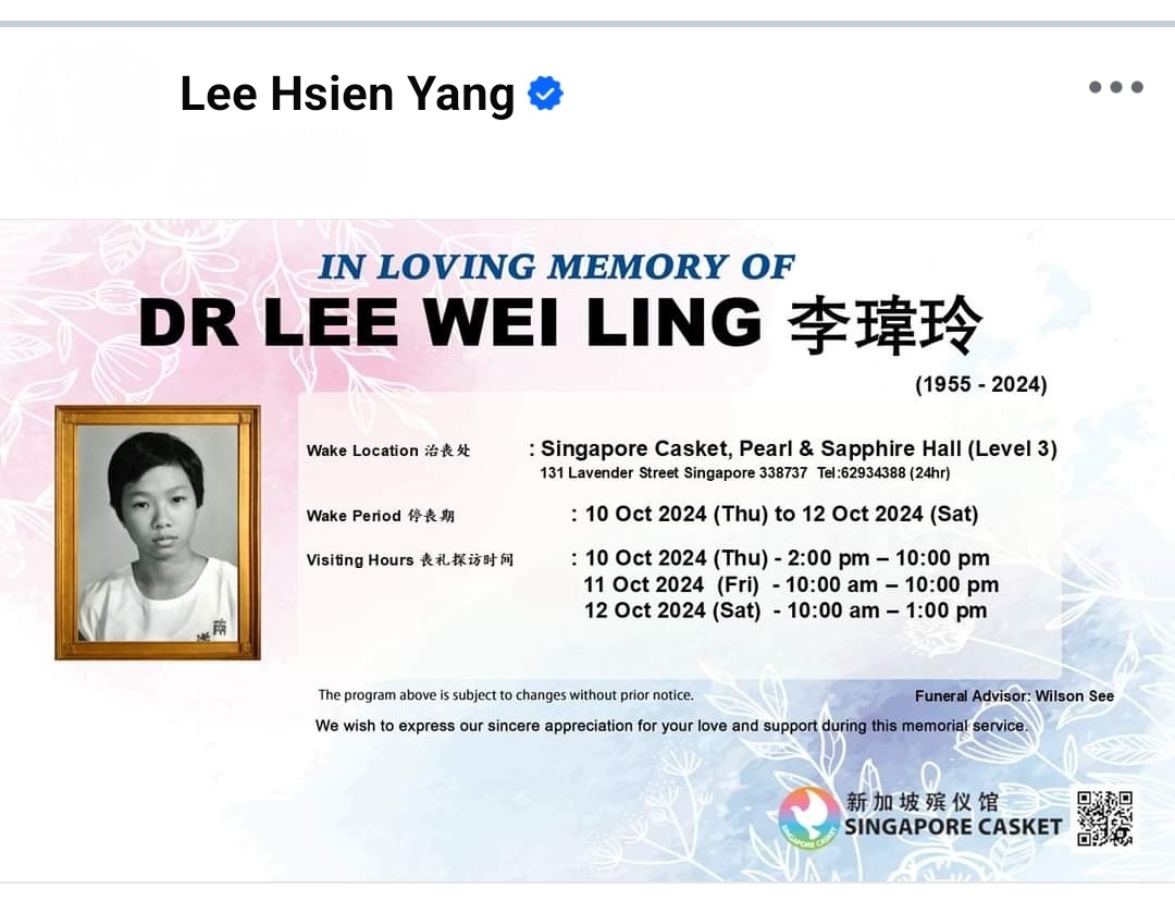 Dr Lee's wake will be held at Singapore Casket with visiting hours are from 2 PM to 10 PM on 10 October, and from 10 AM to 10 PM on 11 October.