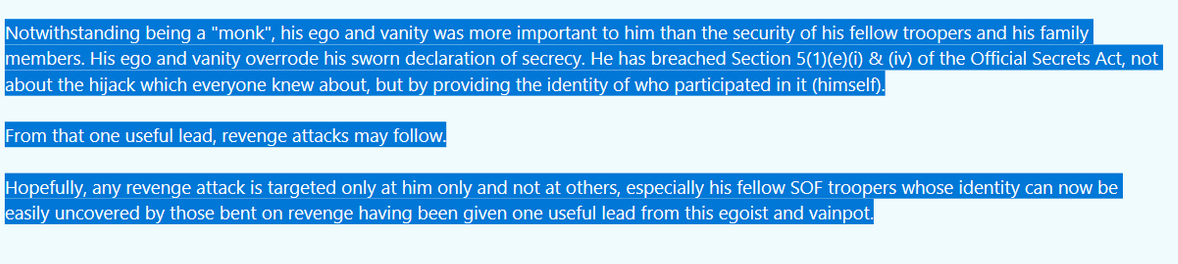 Hopefully, any revenge attack is targeted only at him only and not at others, especially his fellow SOF troopers whose identity can now be easily uncovered by those bent on revenge having been given one useful lead from this egoist and vainpot.