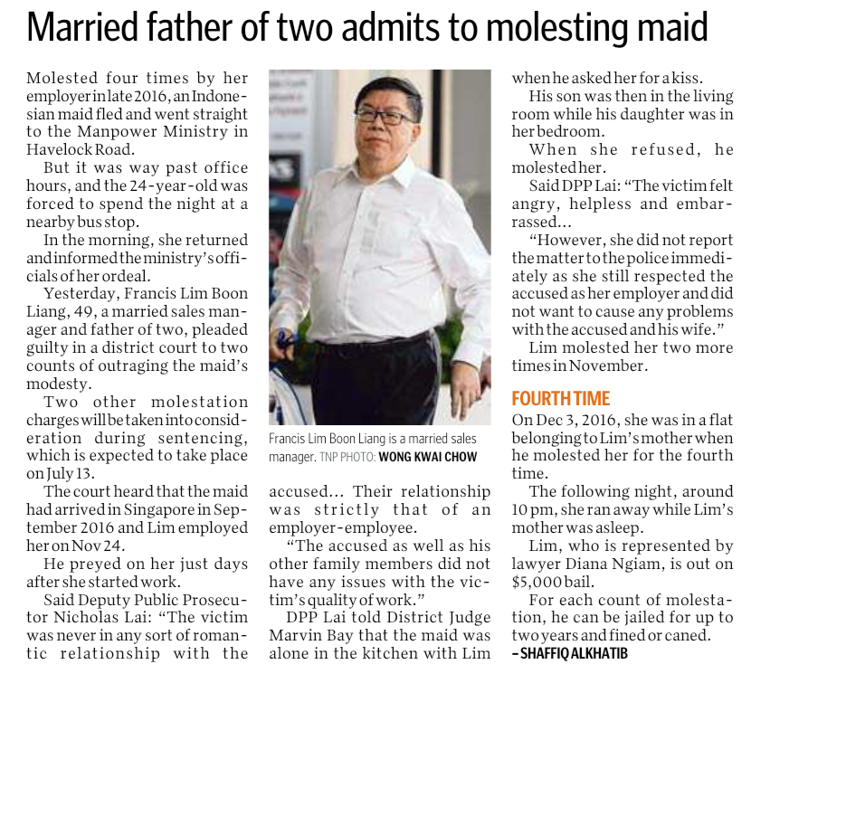 On Tuesday (June 5), Francis Lim Boon Liang, 49, a married sales manager who is a father of two, pleaded guilty in a district court to two counts of outraging the maid's modesty.
