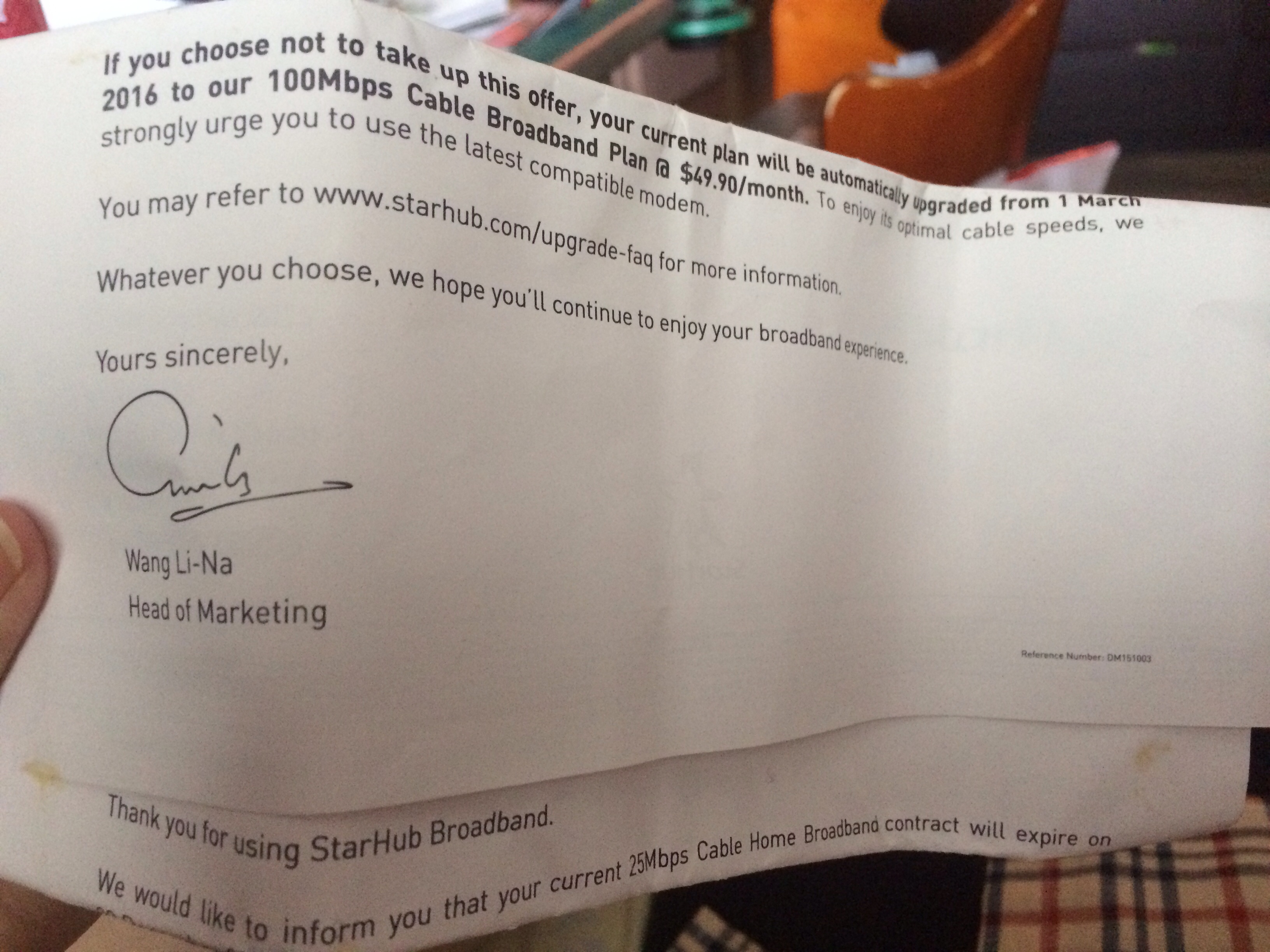 The monkeys at Starhub informed me that upon expiry of my contract, my broadband plan would cease and I would be placed upon a plan costing $49.90. My original plan was $22 before GST.