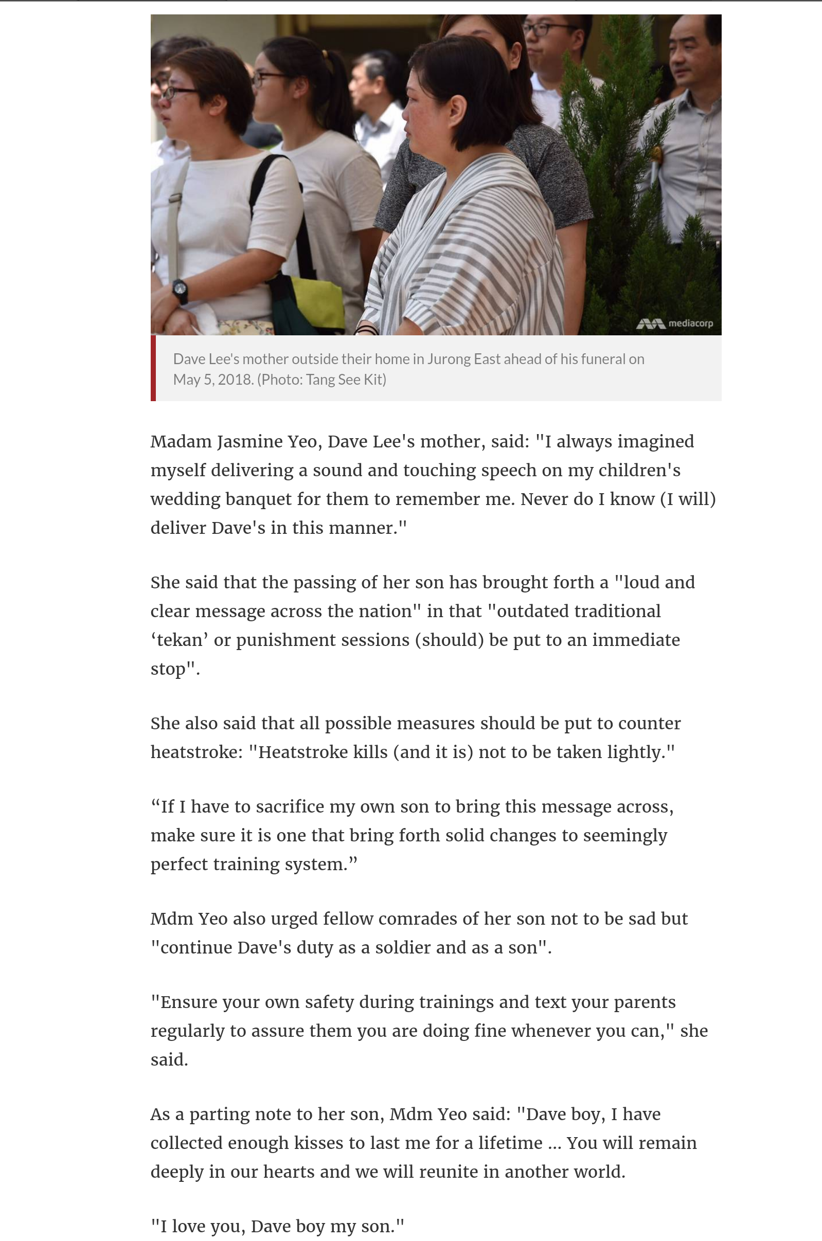 These are not professional soldiers or those who have voluntarily signed on with the SAF. I don't think anyone would give a toss if SAF regulars die during training. This is since they know the risks associated with joining the army as a regular. What we are dealing with are conscript soldiers who have no say about whether they should join the army. As I stated in an earlier post, it's dumbfoundingly stupid to equate deaths as being the hallmark of "realistic" training or a mark of a "real army".