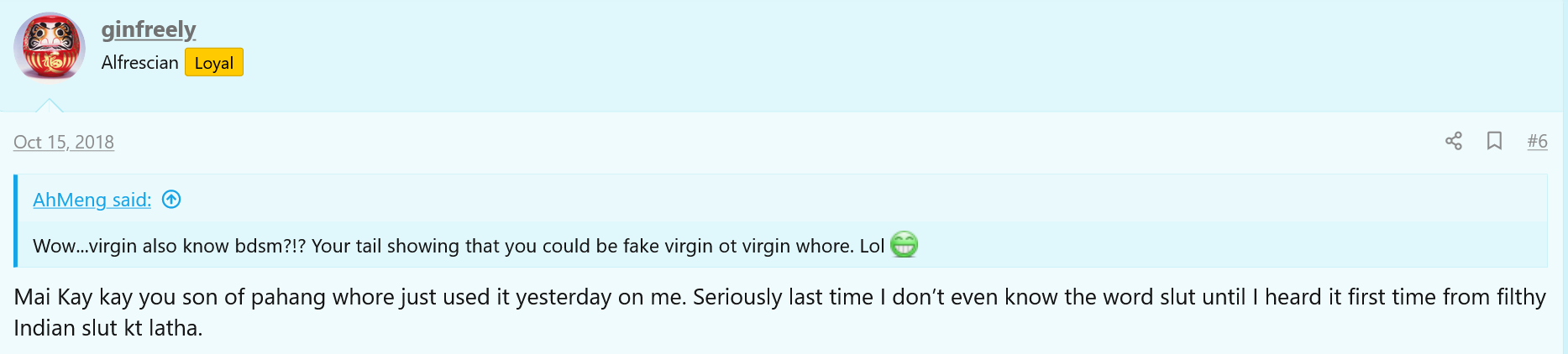 You Cantonese hakka dogs sons of prostitutes @empathizerofeatshitndie @sbfuncle @NanoSpeed @LaoHongBiscuit etc smearing me as prostitutes and slut in bed calling others slut kt latha and son of slut LJ McCully are the ones that do violence to me. And how convenient to repeat lies that your fellow Cantonese my accountant pushed me her benefactor is not violence while I pushed bully that blocked me is violence. Pui!This is a thread of sex and violence.
