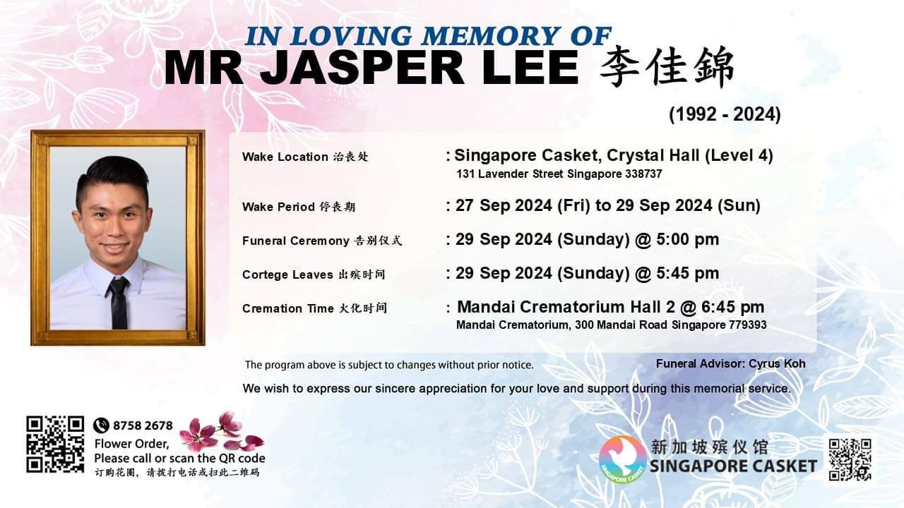 His cremation will be held on Sep. 25 at 3pm, at Mandai Crematorium Hall three.