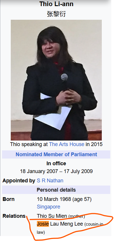 Josie Lau is the niece-in-law of Thio Su Mien, who is the aunt of Dr Alan Chin.
