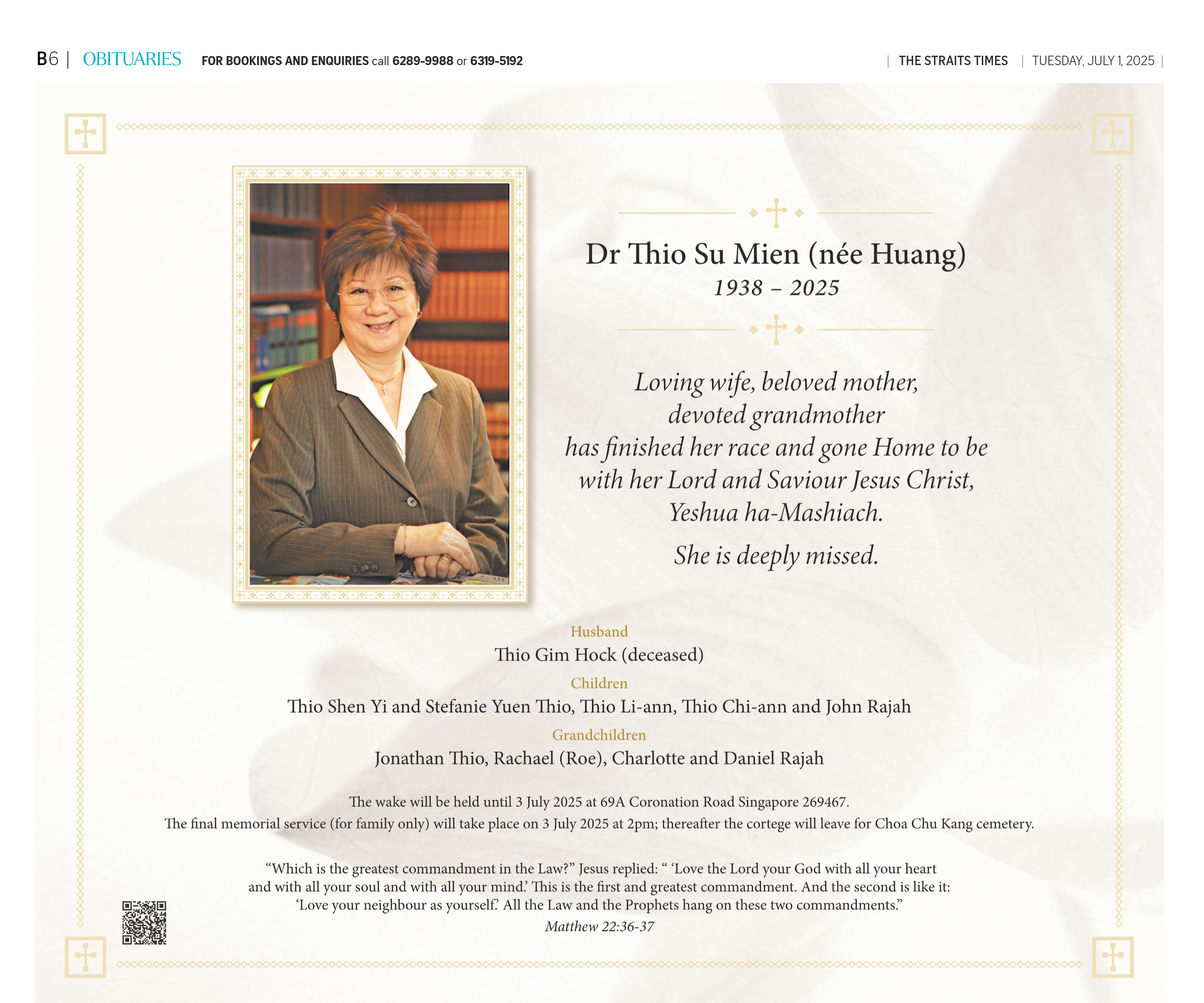 "I join the Thio family in mourning the passing of their mother and grandmother. Su Mien was a member of the pioneering class of law students at what is now known as NUS. We were classmates from 1957 to 1961. She was brilliant and hardworking and was one of the top students. The university recruited her and sent her to London for her doctoral degree. She returned to teach at the Law School. In 1969, when she was only 30 years old she was elected by her colleagues as the Dean. She was a good teacher and leader of the school. After only two years she decided to resign and to join a leading law firm. She wrote to me and urged me to return from the UN and succeed her. I did as she had requested and was the Dean from 1971 to 1974. She subsequently established her own law firm and was highly regarded as one of Singapore’s leading lawyers. We have kept in touch over the years. I have very fond memories of her and will miss her."