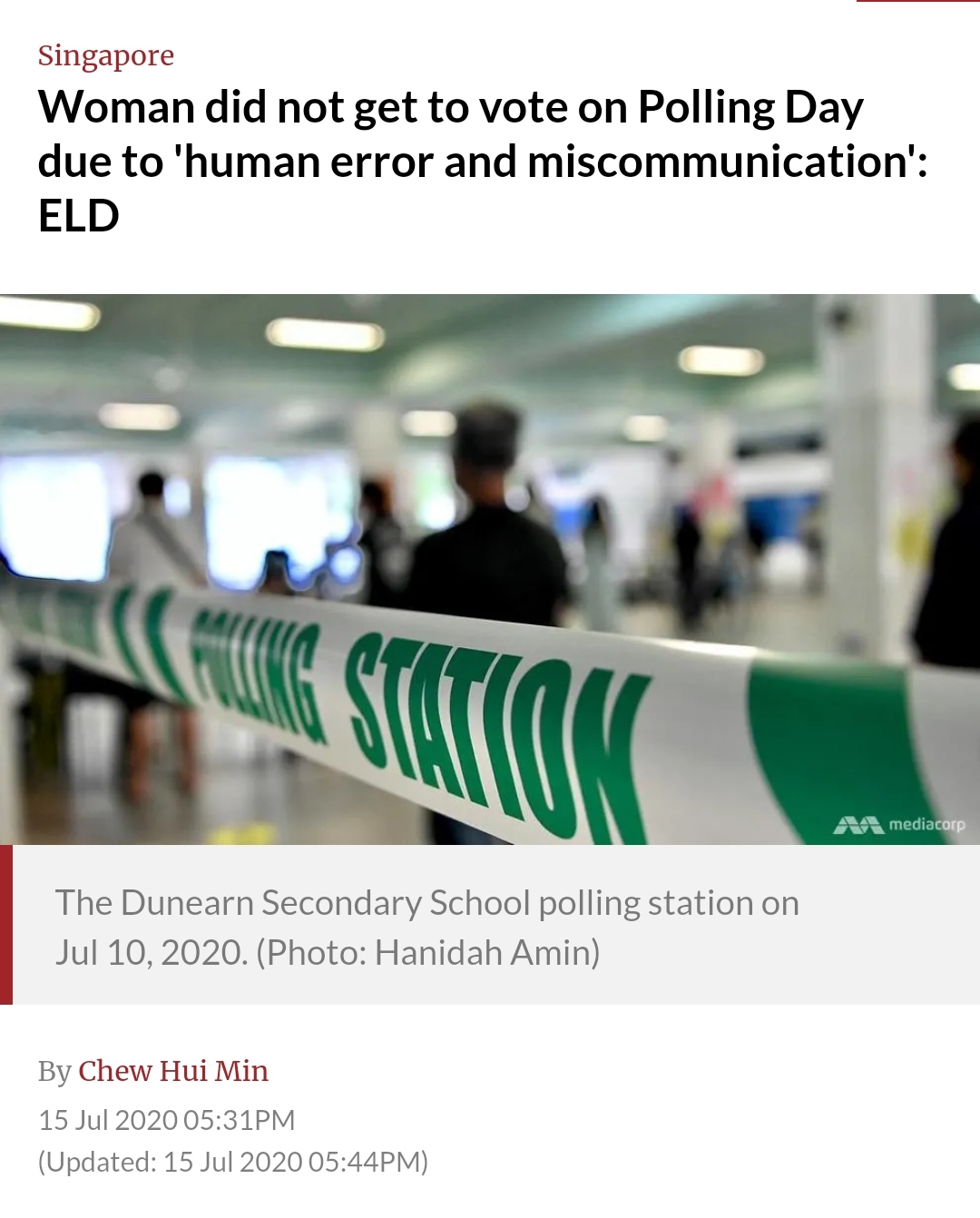 SINGAPORE: Miscommunication between two election officials led to a woman not being able to vote on Polling Day, the Elections Department (ELD) said on Wednesday (Jul 15).