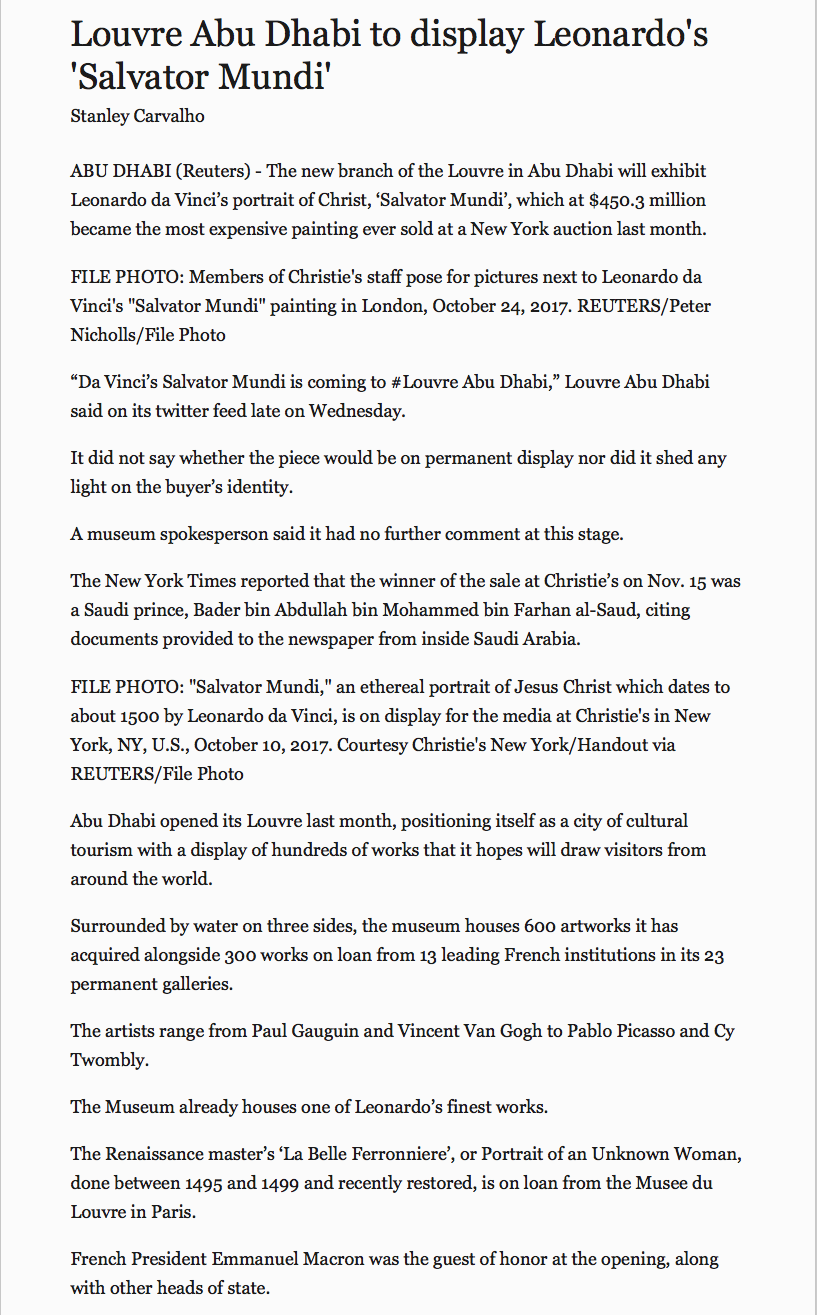 I feel badly short changed now knowing that I missed out on the world's most expensive piece of ART. I had taken a deliberate detour and visited the Louvre at AD shortly after it was opened as I was on my journey of understanding the Gulf. The building has an extremely low profile as in physically low to be part of the Gulf waters. It was beautiful and the roof is a masterpiece. Every thing about the building was architecturally splendid though it was much much smaller than buildings associated with the arts.