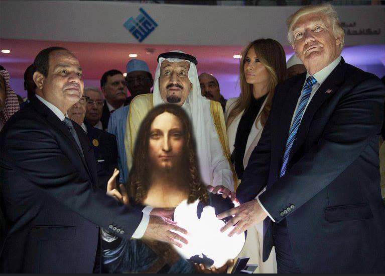 We also urge you to provide insight and guidance to your Muslim grassroots umaah as I have been told they are in a great state of confusion, despair and anxiety that the most powerful member of the nation of the Guardian of the Two Mosques has flagrantly flaunted strict Sunni laws on iconography let alone one of Isa for half a billion dollars whilst Sunni neighbours to the south are overcome by starvation and cholera due to their blockade. And revealed in the same week they gave Jerusalem away too!