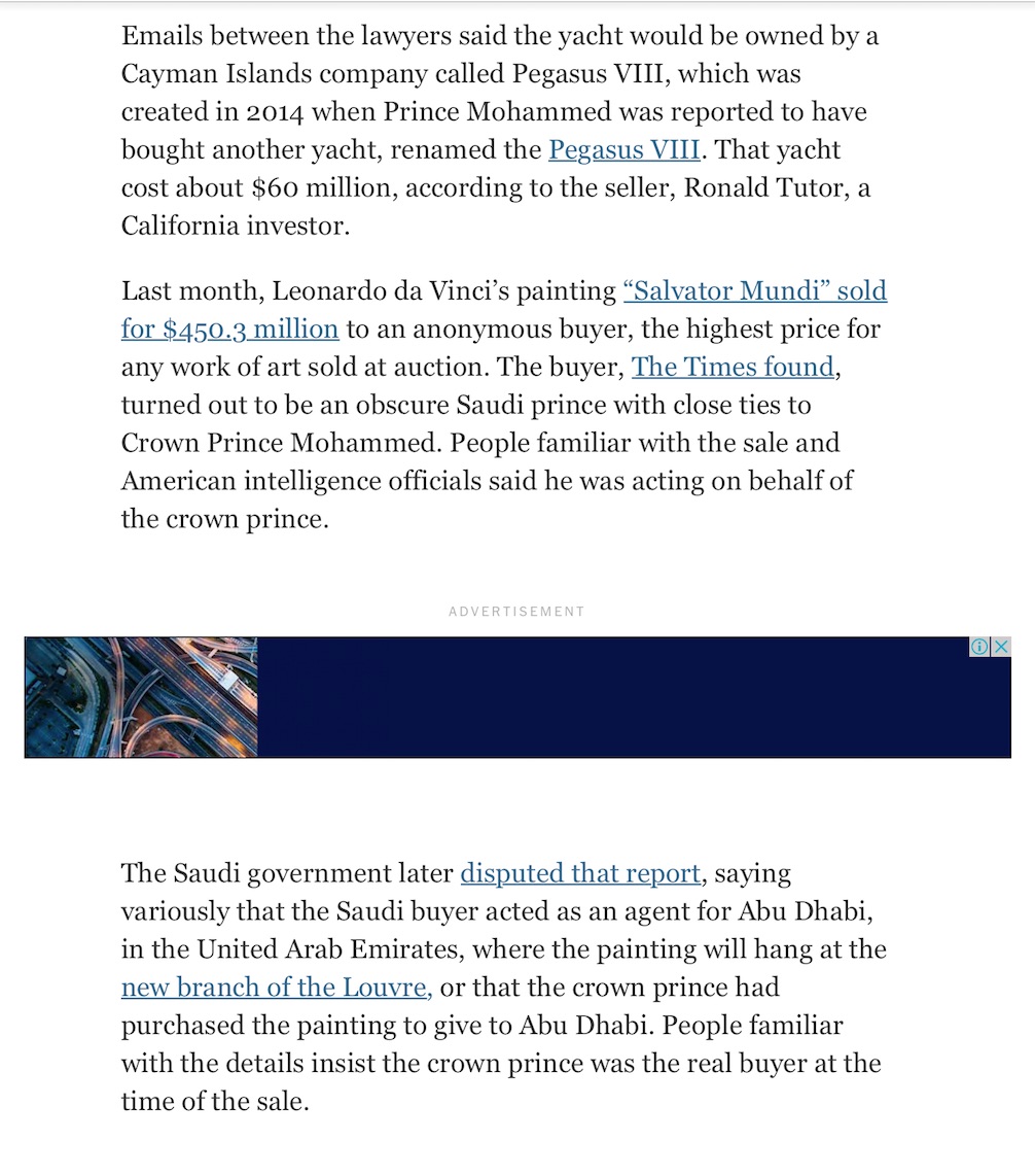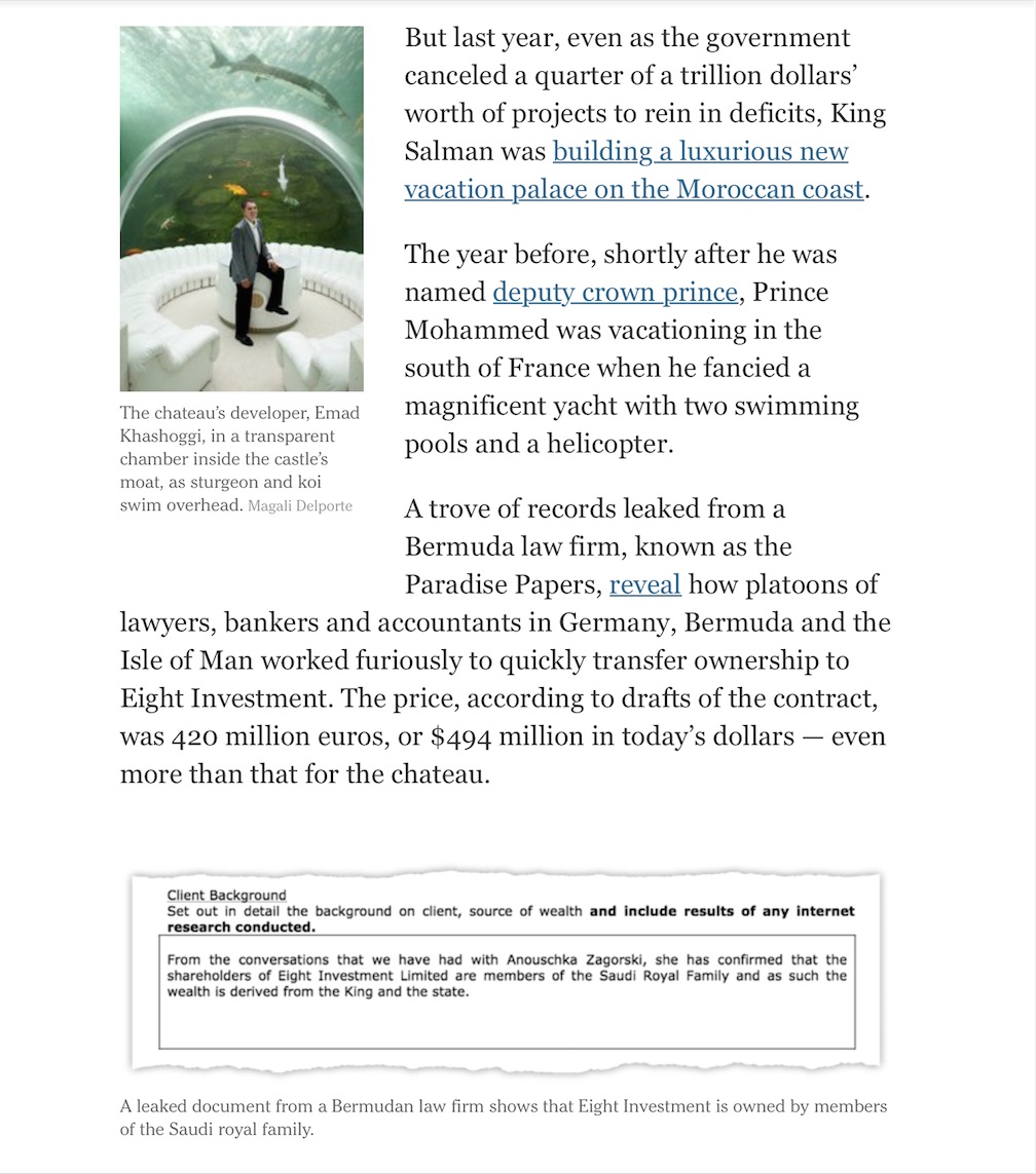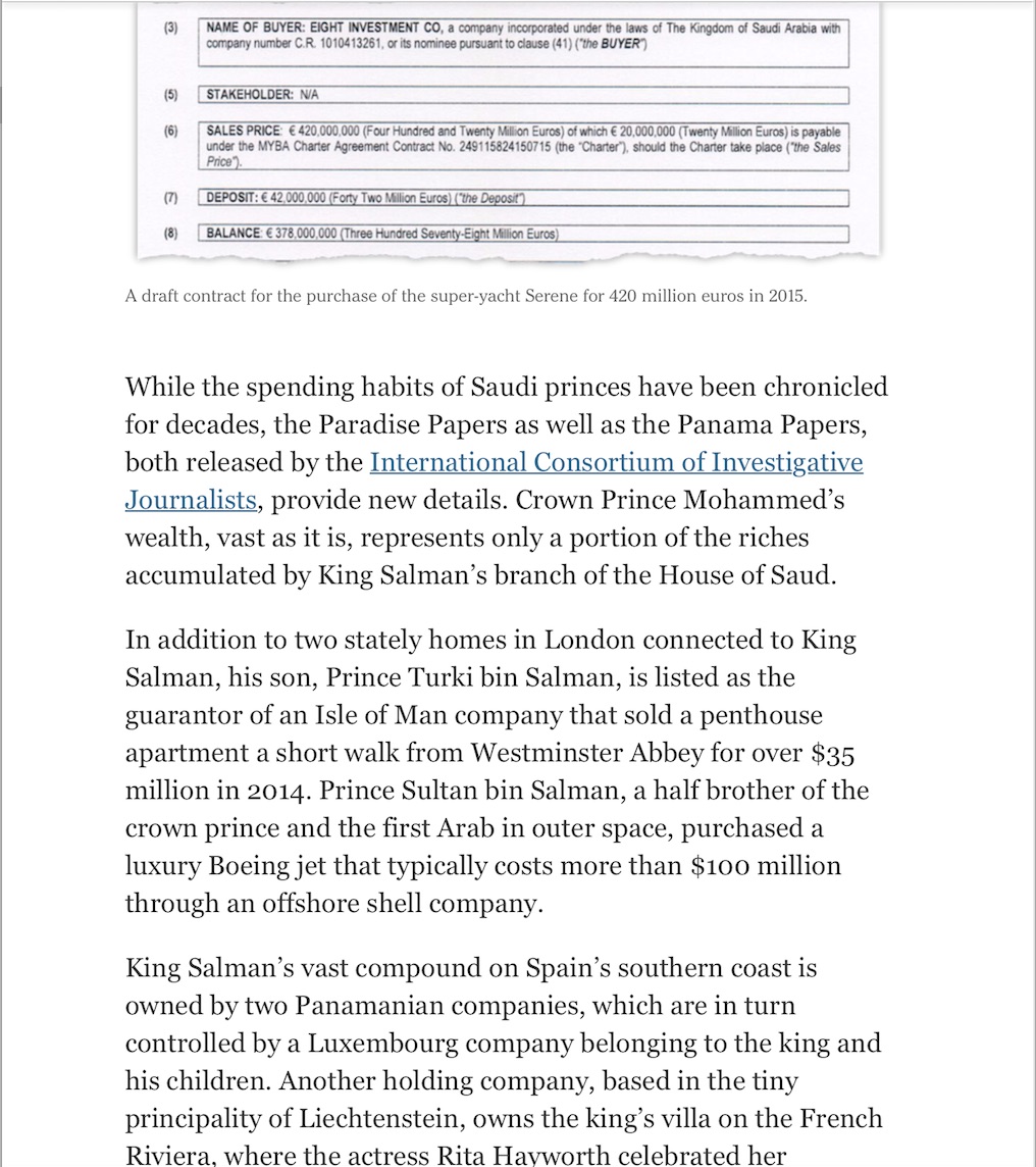 Could MBS be inadvertently setting the stage for his own assassination? He has created so many enemies within the very extended, incestuous and vested royal household that this is something not far fetched, plus considering all the sectarianism,sibling rivalries and palace intrigues that go on. That's not counting enemies he has created abroad. Has he created any new friends other than the Americas and the Israelis? The sort of friends who will not just move on to the next pawn after he is gone? The last royal assassination to take place was in 1975 of King Faisal by his own nephew. He too had embarked on a crusade to rescue the country's finances and implementing a policy of modernization and reform (although he was assassinated for different reasons). It may sound melodramatic but the Ides of March are not too far away and there could well be a "Et Tu Brutus" moment if MBS continues head on with his reckless, arrogant and some what bizarre behavior, by Saudi standards anyway. In any case, whatever the outcome, the rule of MBS is increasingly looking untenable in the scheme of things and likely to not end well.