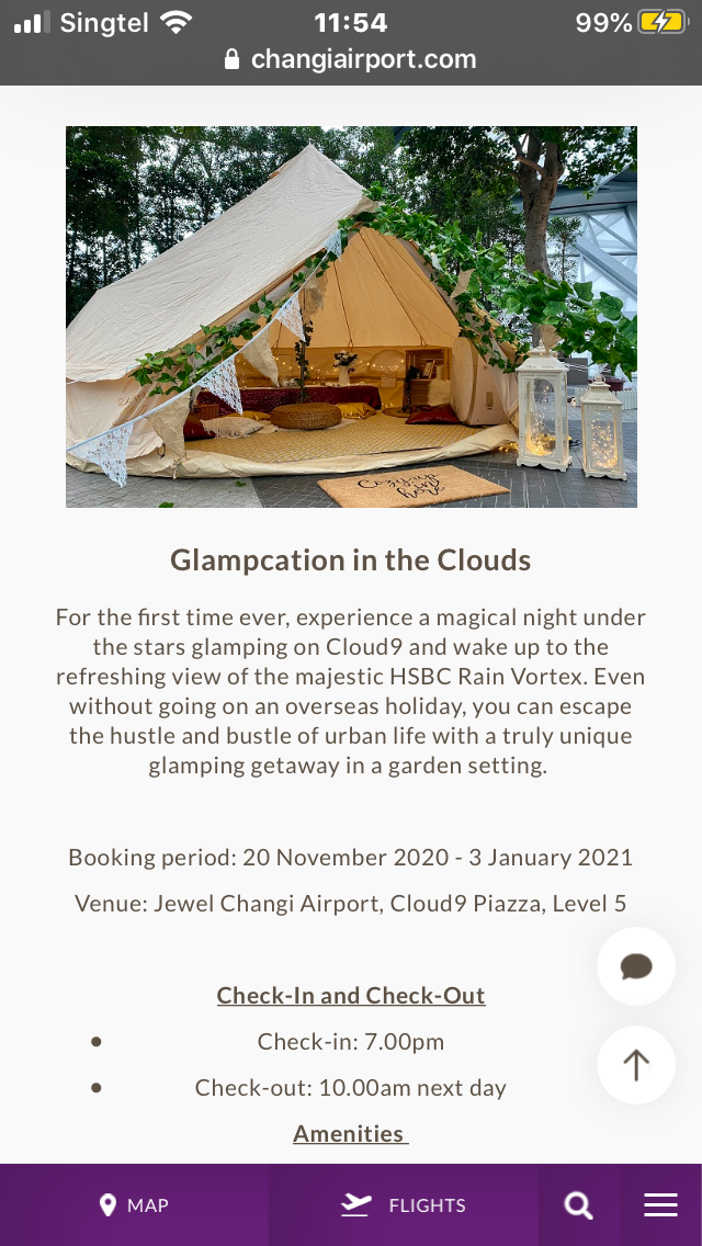 The Changi Airport Group announced on its Facebook page on Tuesday (17 November) that it will be launching a series of “unique experiences and activities” this year-end, in which one of experience include “glamping” at Jewel Changi Airport.