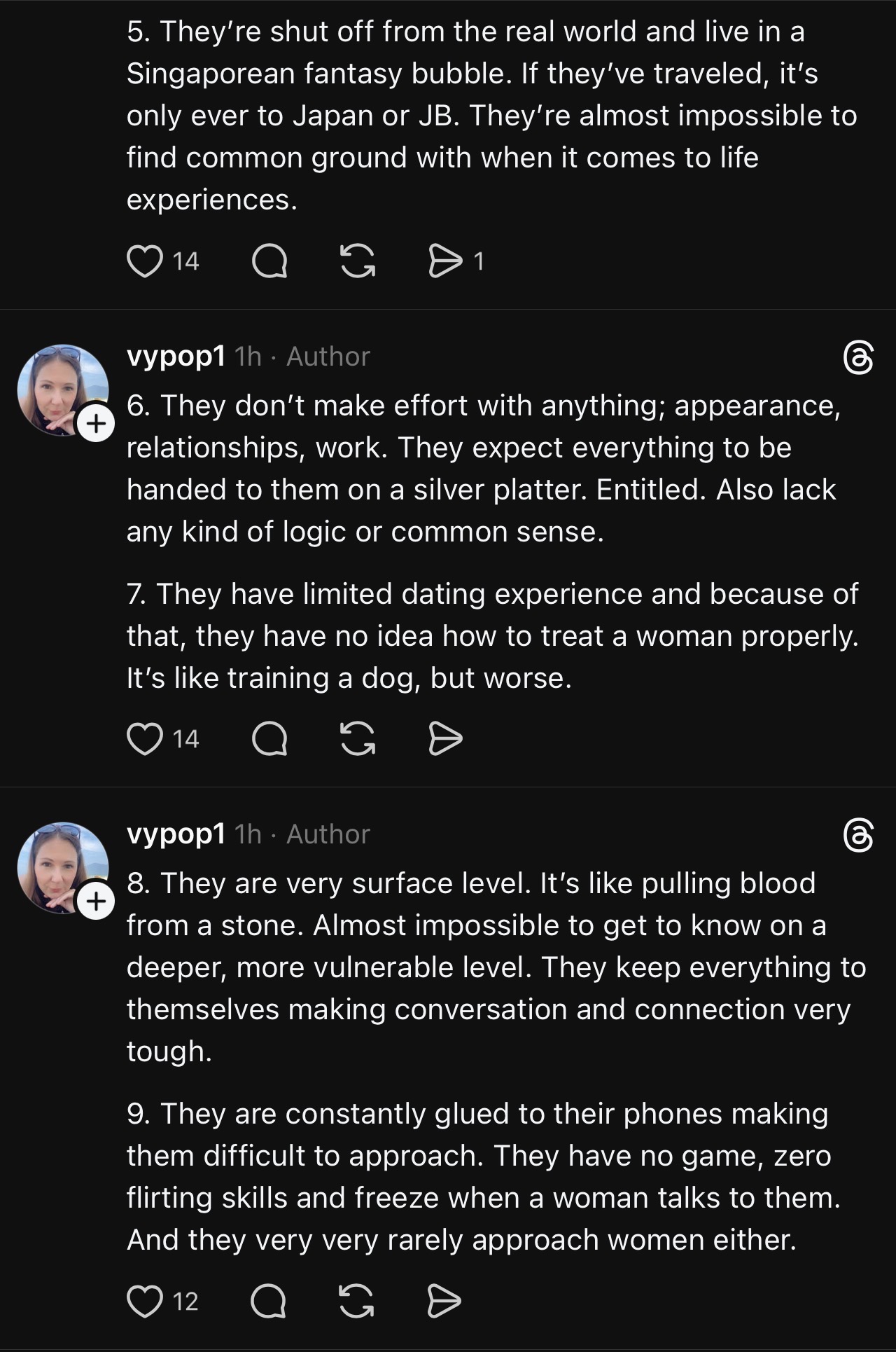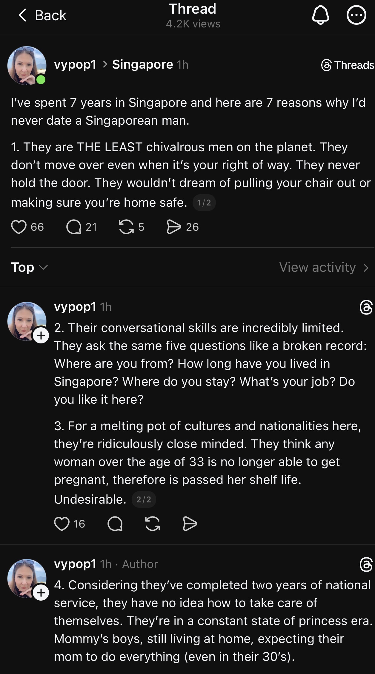 This expat woman is well past her expiry date, and that is why no S'porean man is interested in her. She is lashing out in utter frustration.She should be introduced to Samsters. Then she'll change her perspective of Sinkie males.