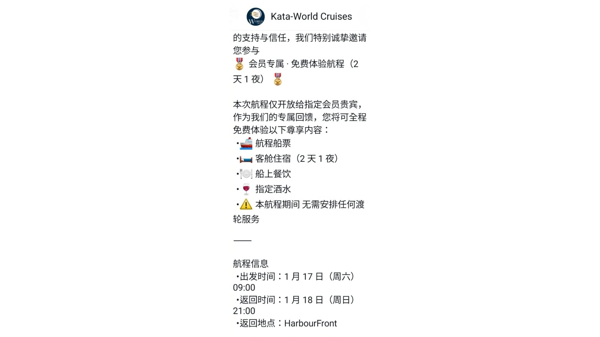 We just added a new 2D1N sailing from Harbourfront on 17 January, 9am and arriving back on 18 January, 9pm - for a fuss-free staycation on the seas!